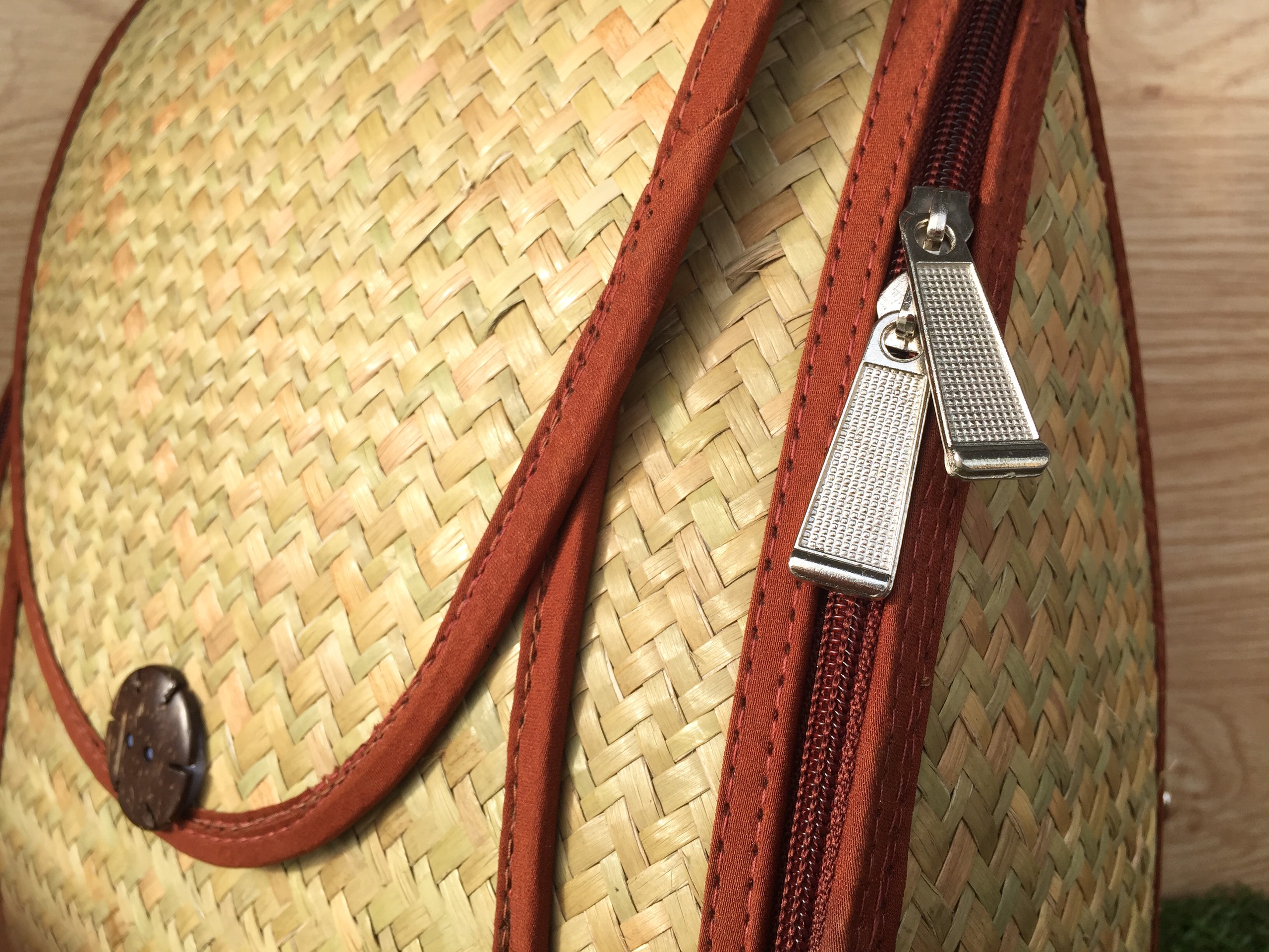 Balo Bàng Cỡ Lớn được làm từ 100% cỏ bàng tự nhiên và các phụ liệu, do các nghệ nhân địa phương đan thủ công tỉ mỉ. Lớp ngoài chắc chắn, kết hợp với lớp vải lót mềm mại bên trong tạo nên sự hài hòa độc đáo.