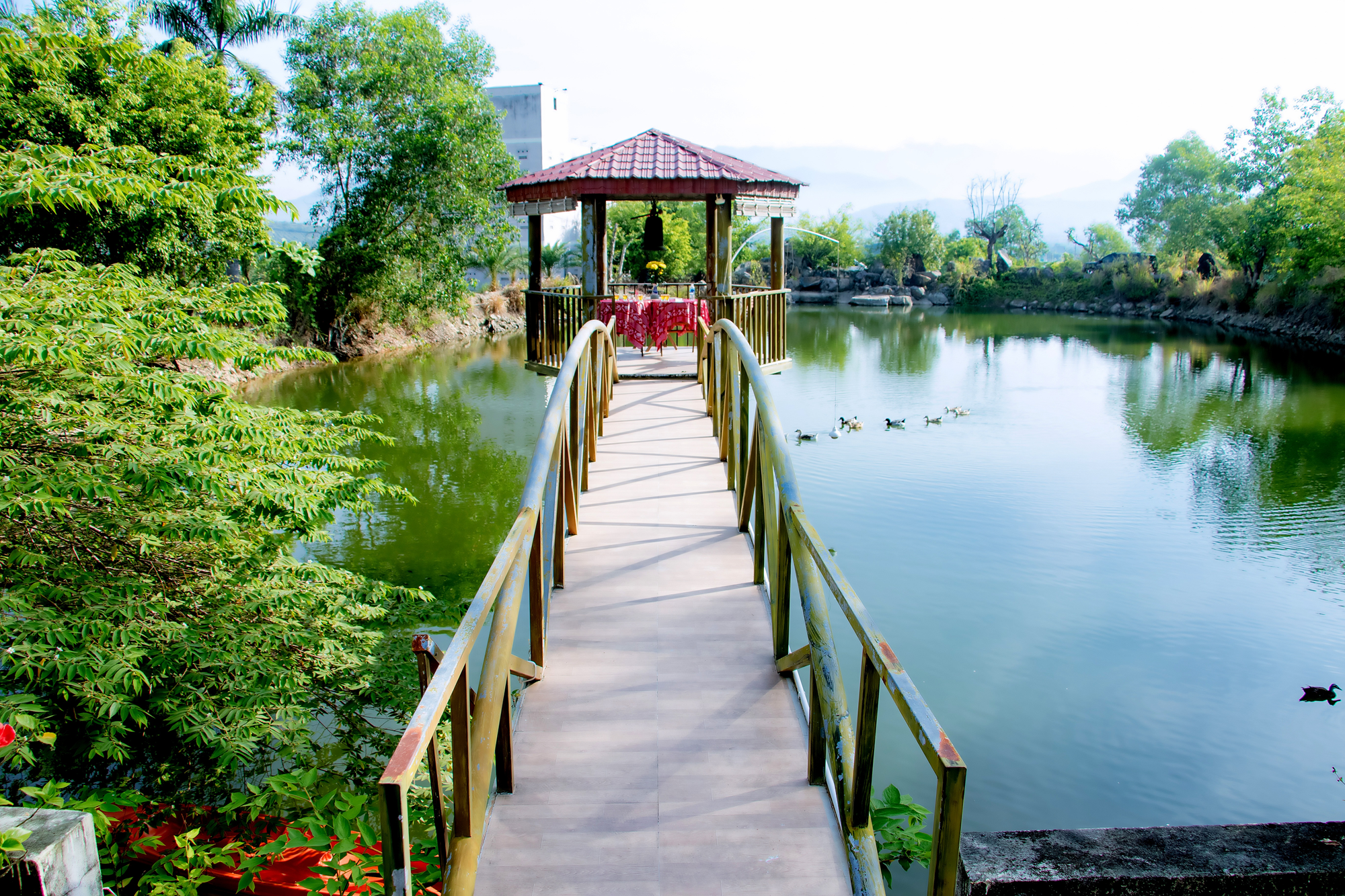 Phía trước nhà thờ có hồ nước lớn diện tích 3.200 m2, sâu 7 m, được bố trí làm cảnh quan phong thủy và nuôi cá, sân vườn rộng rãi nhiều loại cây trái, đường bao quanh hồ, nhiều tiểu cảnh bằng cây cổ thụ và đá khối đan xen, đặc biệt có tượng phật Di lặc được tạo tác bằng đá nguyên khối, nặng 68 tấn, có tượng Phật bà quan âm đứng trông ra hồ; bên trái nhà thờ là nơi thờ thần linh thổ địa, bên phải là nhà khách, nhà sinh hoạt cộng đồng (kết hợp nuôi chim yến), nhà bếp, cổ vật, bồn cây, hoa cảnh. Bao quanh là tường gạch thấp, cổng tam quan cổ. Khuôn viên gắn liền với thiên nhiên: cây cảnh, cây ăn trái, nuôi chim yến, gia súc, gia cầm, tạo thế phong thủy “tiền minh đường – hậu chẩm” (trước thoáng – sau có núi đỡ).