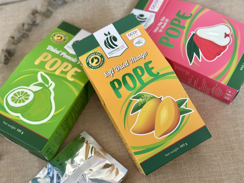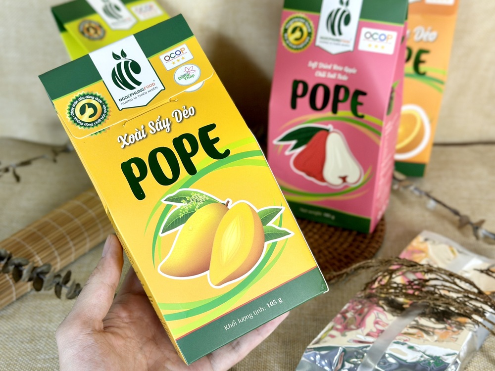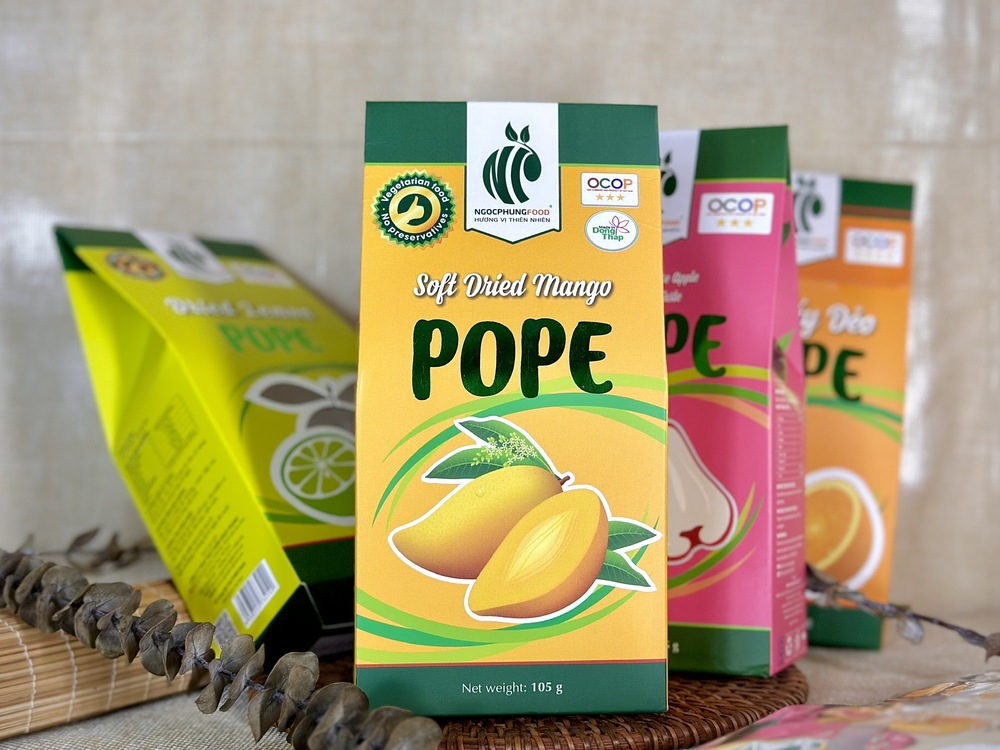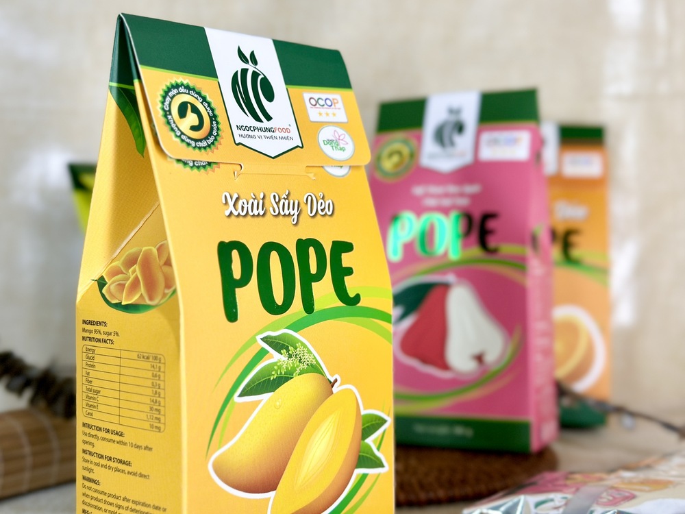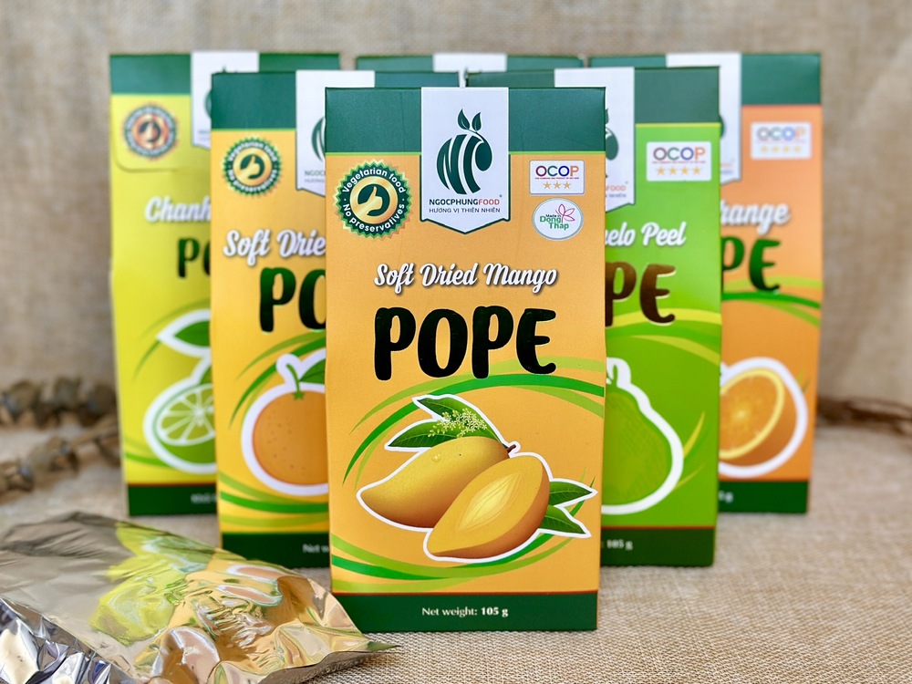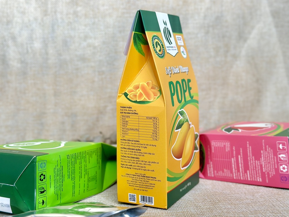 Công ty Ngọc Phụng luôn đề cao chất lượng và quan tâm đến sức khỏe của khách hàng, với khát vọng mang đến những sản phẩm hoàn toàn từ thiên nhiên, tươi ngon và an toàn. Xoài sấy dẻo POPE đã có mặt trên các kệ hàng đặc sản, sàn thương mại điện tử, và trở thành món quà đầy ý nghĩa trong các dịp lễ. Thưởng thức sản phẩm của chúng tôi, quý khách hàng sẽ cảm nhận được hương vị rất riêng và đặc trưng của trái xoài Cao Lãnh – một đặc sản quê hương. Sản phẩm là minh chứng cho nỗ lực không ngừng nghỉ của Ngọc Phụng trong việc gìn giữ và truyền tải hương vị tự nhiên nhất đến tay người tiêu dùng.